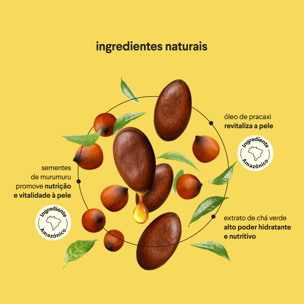 Água, Manteiga da Semente de Cacau, Pó da Semente de Murumuru, Álcool Cetearílico, Pó da Semente de Damasqueiro, Trealose, Ácido Estárico, Cetearete-20, Óleo da Semente de Pracaxi, Fenoxietanol, Carbômer, Edetato Dissódico, Extrato da Folha de Chá-da-Índia, Monoisopropanolamina, Etilhexilglicerina.