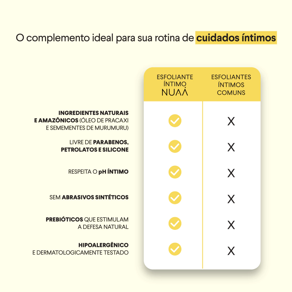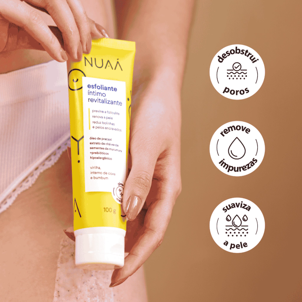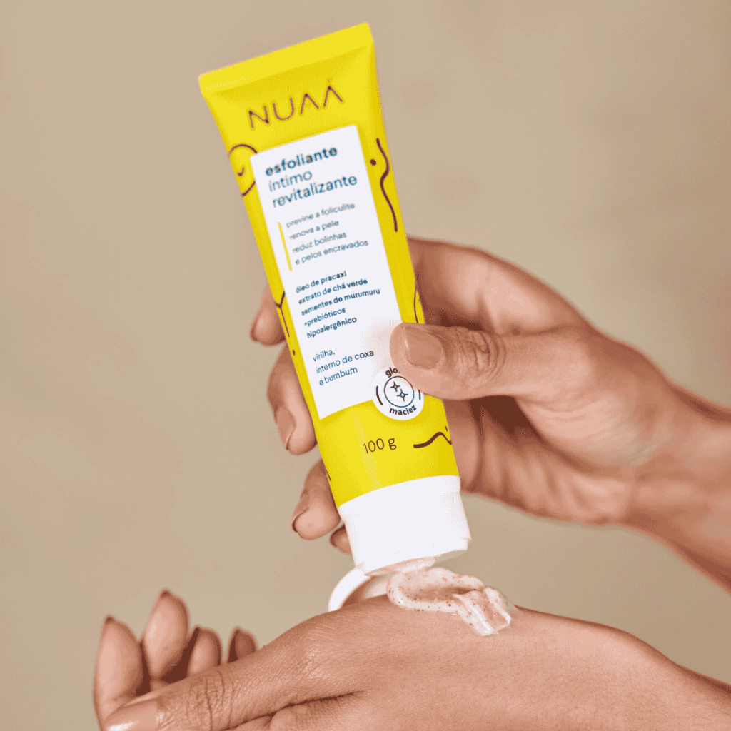 O esfoliante íntimo revitalizante NUAÁ pode ser usado desde a puberdade até a menopausa como parte da rotina de v.care.